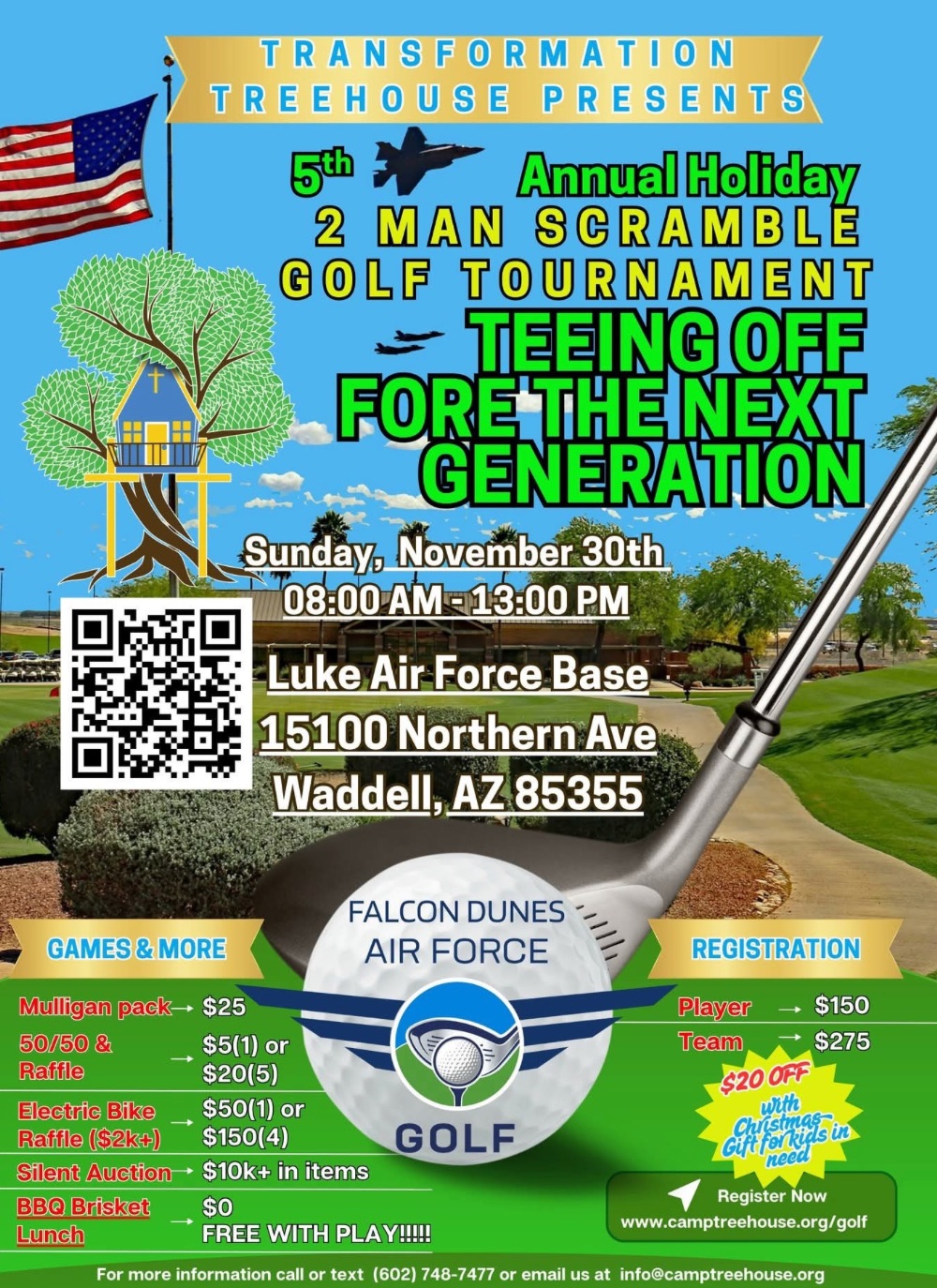 On Sunday, November 30th, the highly-regarded, military-exclusive Falcon Dunes Golf Course opens its gates to the public for the Transformation Treehouse Annual Charity Tournament. This is a bucket-list opportunity for all golfers to play an Air Force premier championship course that is normally off-limits.